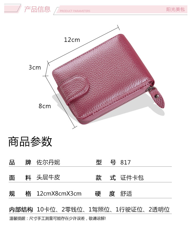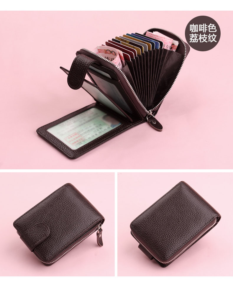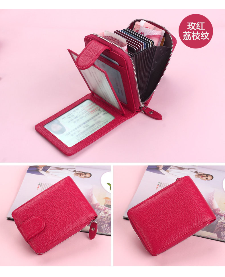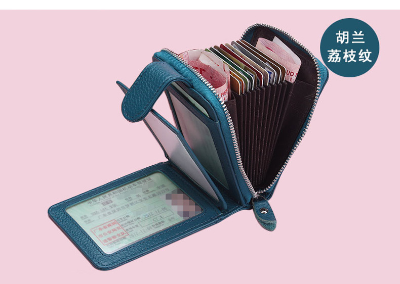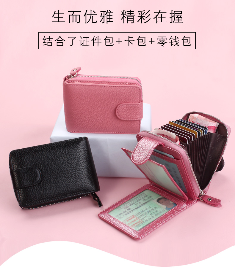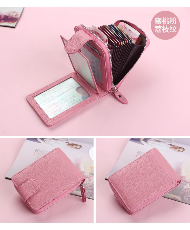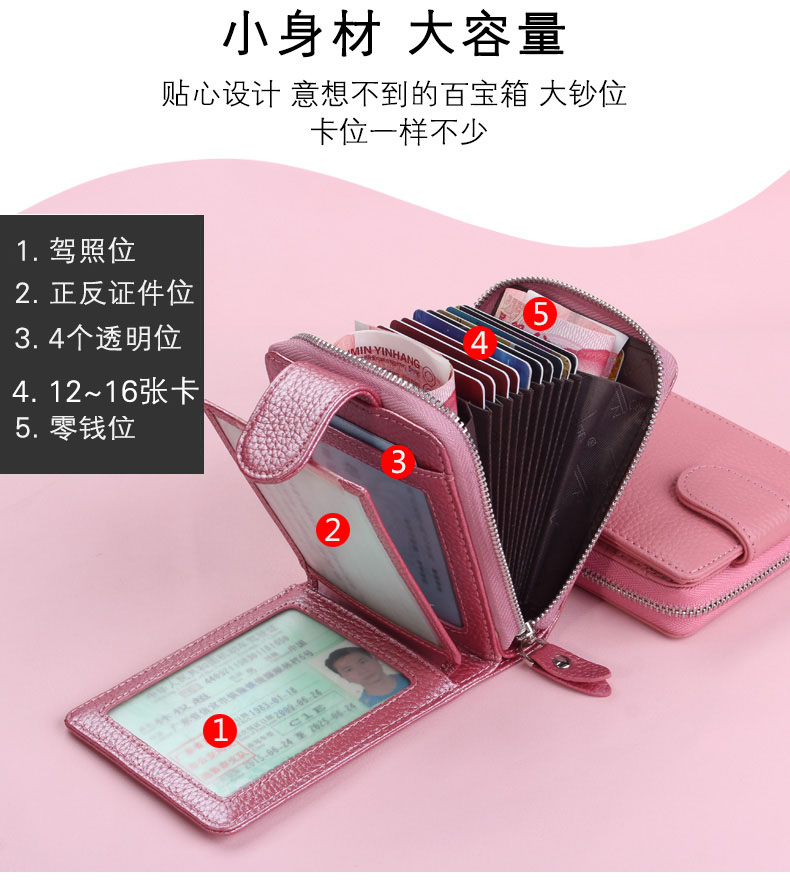 佐尔丹妮 卡包女士头层牛皮拉链风琴多卡位大容量多功能驾驶证皮套男 817粉红色