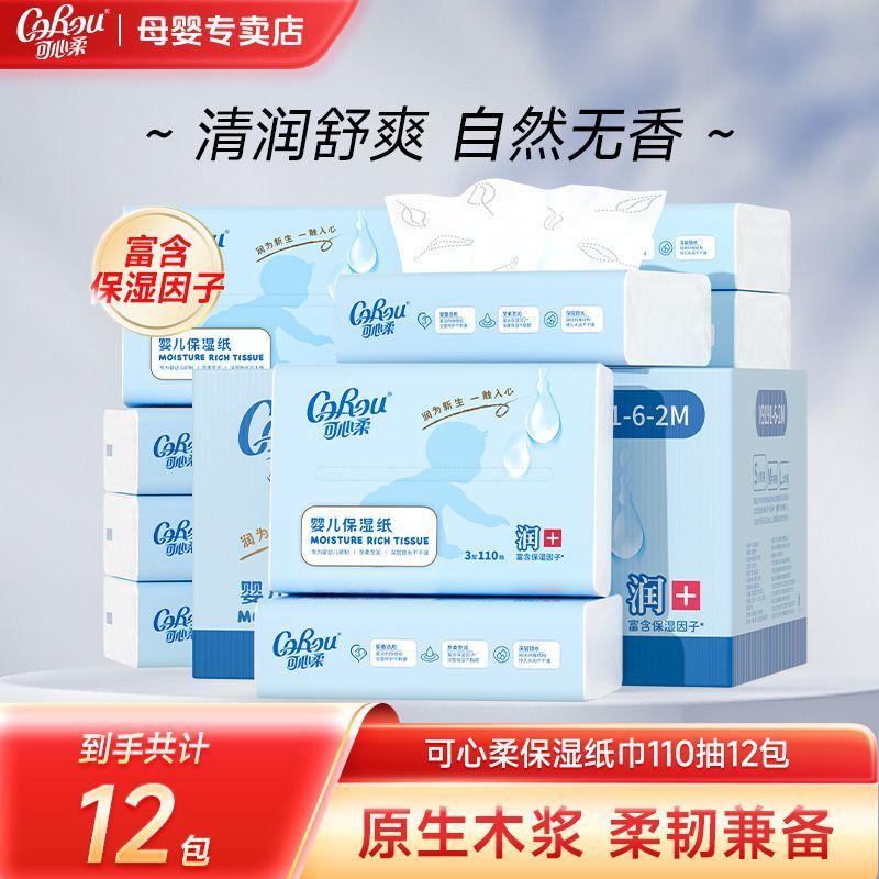 可心柔V9婴儿柔纸巾宝宝纸巾超柔超软乳霜纸3层110抽12包柔软抽纸